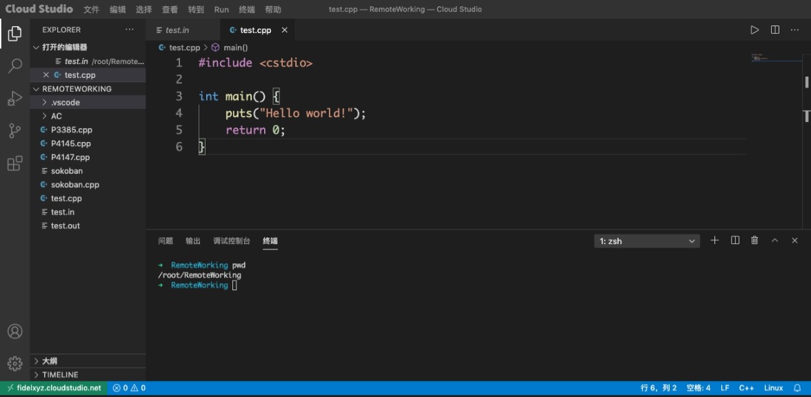 进入工作空间,你会发现 Cloud Studio 的界面与 VS Code 完全一致高度相似。熟悉 VS Code 的读者可以跳过此部分。