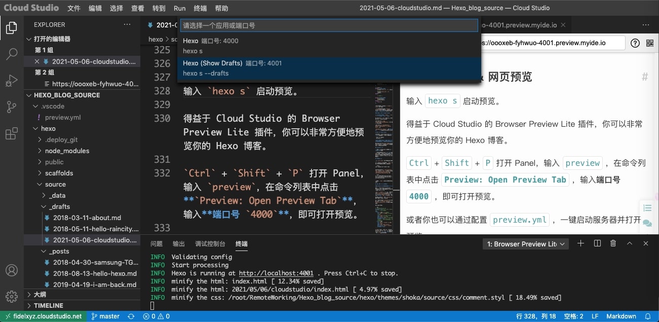 得益于 Cloud Studio 的 Browser Preview Lite 插件,你可以非常方便地预览你的 Hexo 博客。