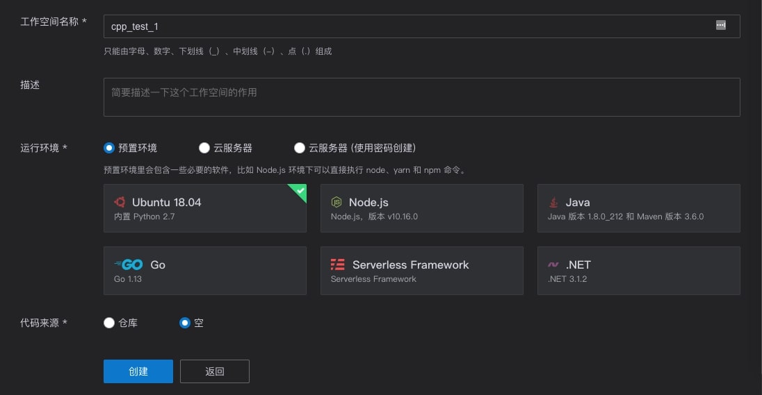 关于 「运行环境」:这里我们选择 「预置环境」。(有服务器的大佬也可以连接云服务器使用,风险自行承担。)